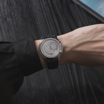 As if carved from a single block of steel, Ecce Vesperal stands out for its elegance that is both raw and sophisticated. Its brushed, minimalist dial is adorned with finely executed beveling to reveal a blue border that changes with the light of day and night.