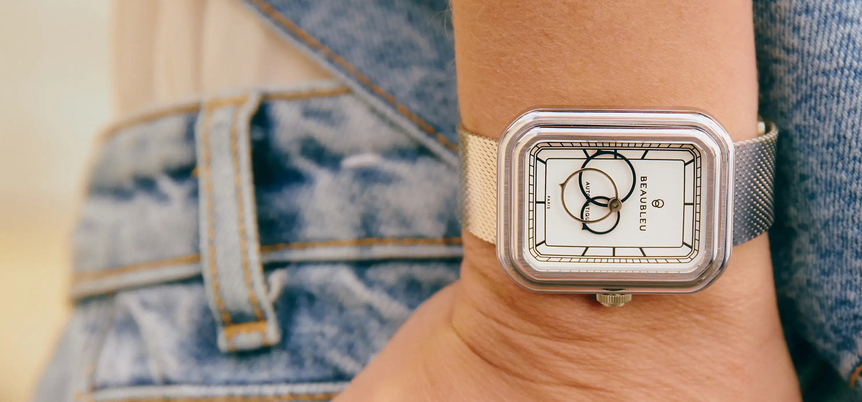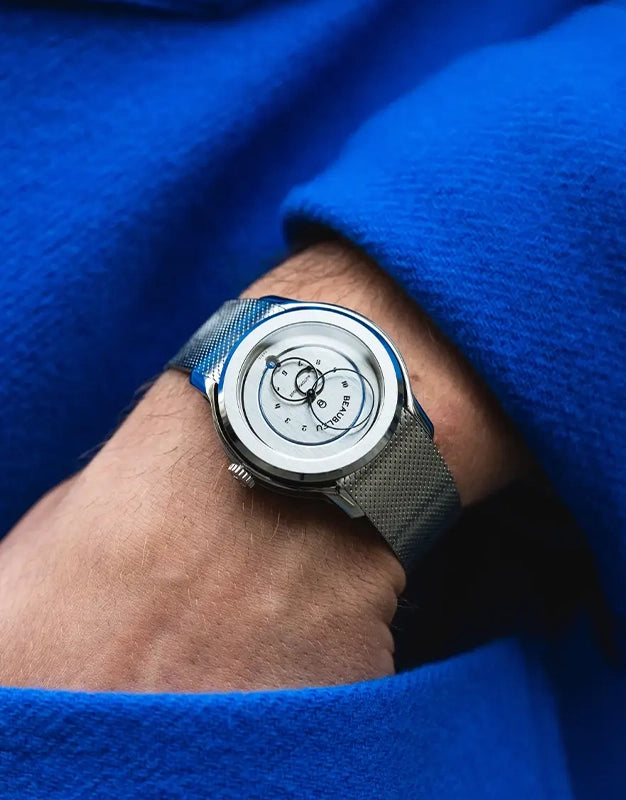 Créé en 2021, le bracelet en acier Beaubleu a nécessité de nombreux mois de recherche et développement pour aboutir à cette conception articulée en lame d’acier, qui suit harmonieusement les courbes de la montre et du poignet. Sa douceur, sa légèreté et sa souplesse en font l’allié parfait pour vous accompagner avec style et confort dans toutes vos escapades.
