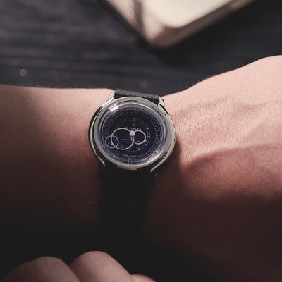 La montre - 19.24, Bleu De Minuit - se caractérise par la profondeur de son cadran émaillé. La tampographie et la pointe des aiguilles font un subtile clin d’oeil à l’horlogerie d’antan. La seconde ponctue l’ensemble en flottant sous un verre bombé à double dôme.